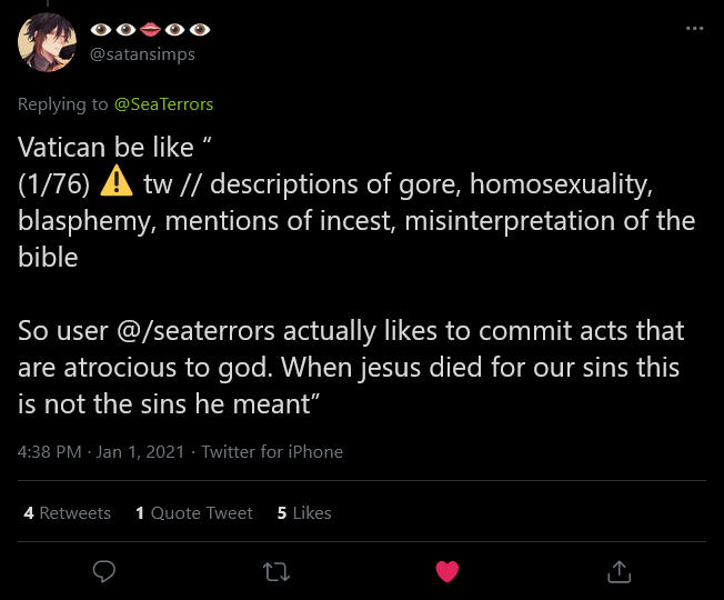 Sometimes I do fandom stuff but at a distanceCollector of niche things and even more obscure shipsI write queer horror stories about angels and Gods and those who chase themAlso adult content no one under 18 follow me or read my stuff please"What does problematic i guess mean?"i consume and create content that contains extreme violence, gore, dubcon/noncon, kink, and monster fuckerythis can be uncomfortable for some folks so i put it there as a way to let folks know that content may show up at random on my twitter